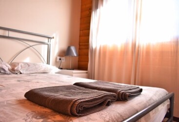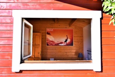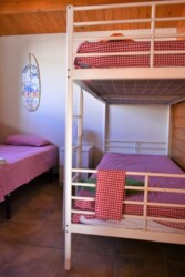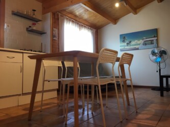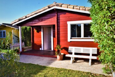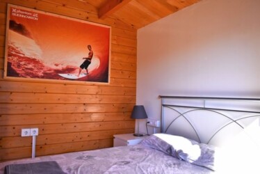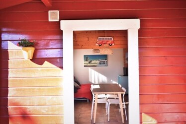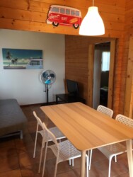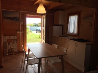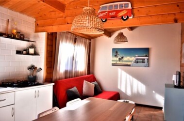 Este bungalow tiene 42 m² de capacidad para alojar a 4 personas, cuenta con dos habitaciones, una de ellas tiene 1 cama de matrimonio, la otra habitación tiene 1 litera y 1 cama simple 90, cuenta con 1 baño y cocina americana. La cocina está equipada con una placa a gas y una nevera, además de utensilios de cocina.