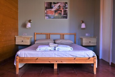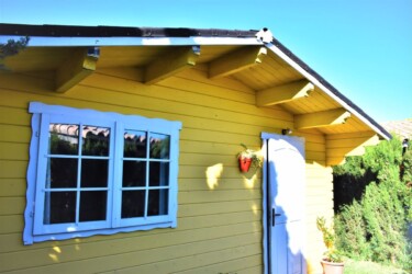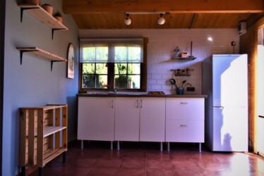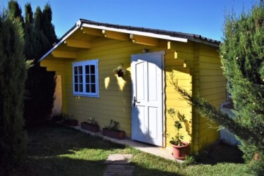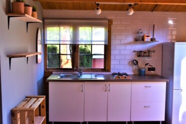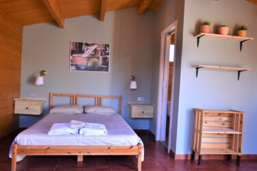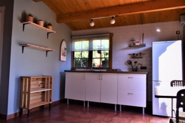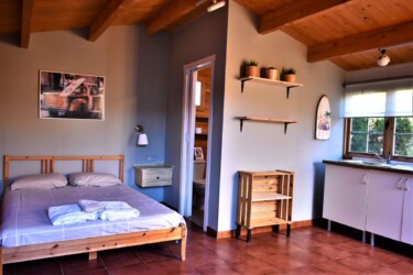 Este bungalow tiene 25 m² es ideal para una pareja, es de una habitación diáfana con 1 baño y 1 cama de matrimonio y con posibilidad de poner alguna cama supletoria para un niño o un tercer adulto. Tiene una cocina americana con una placa a gas y una nevera, además de los utensilios de cocina.